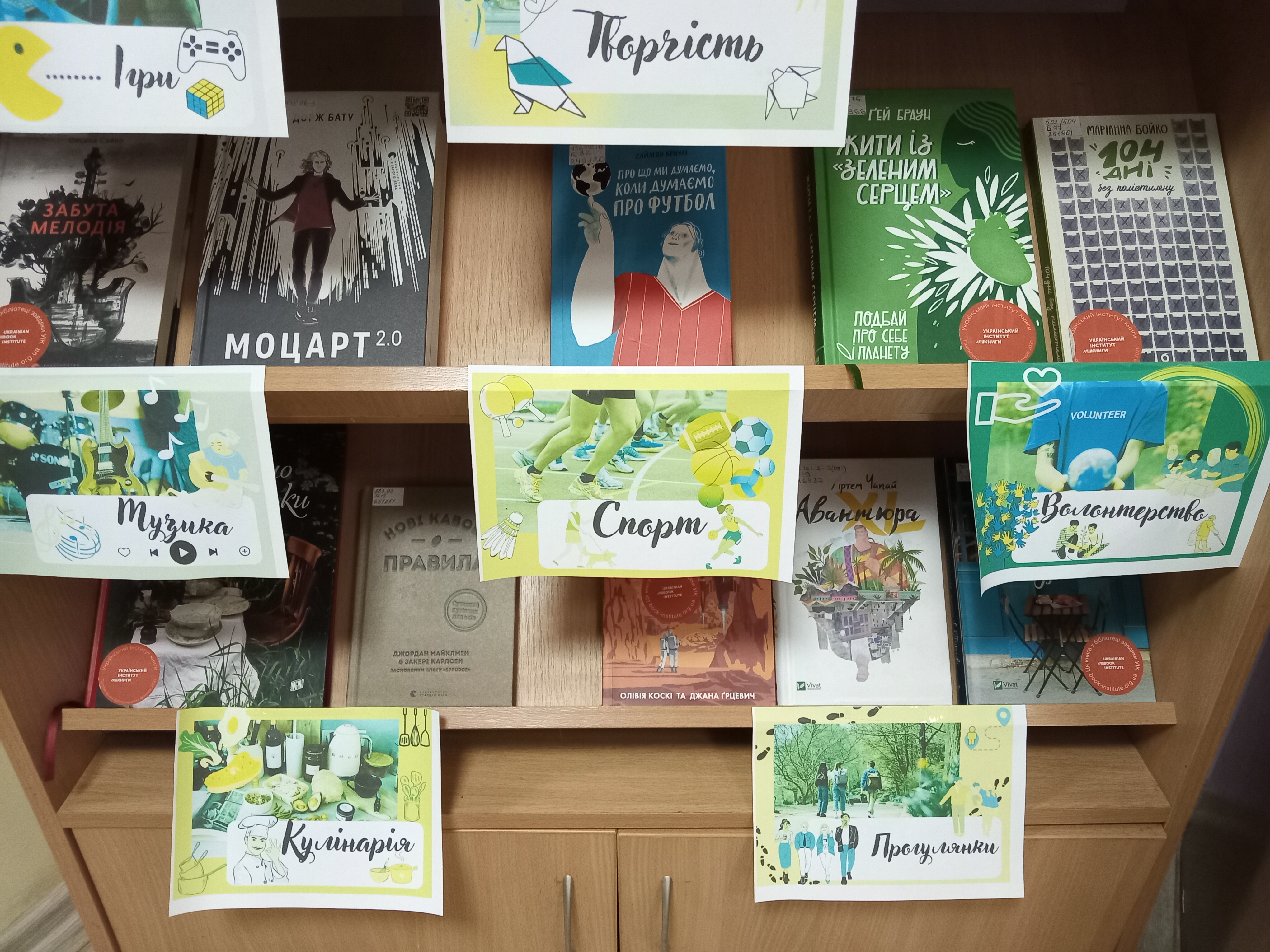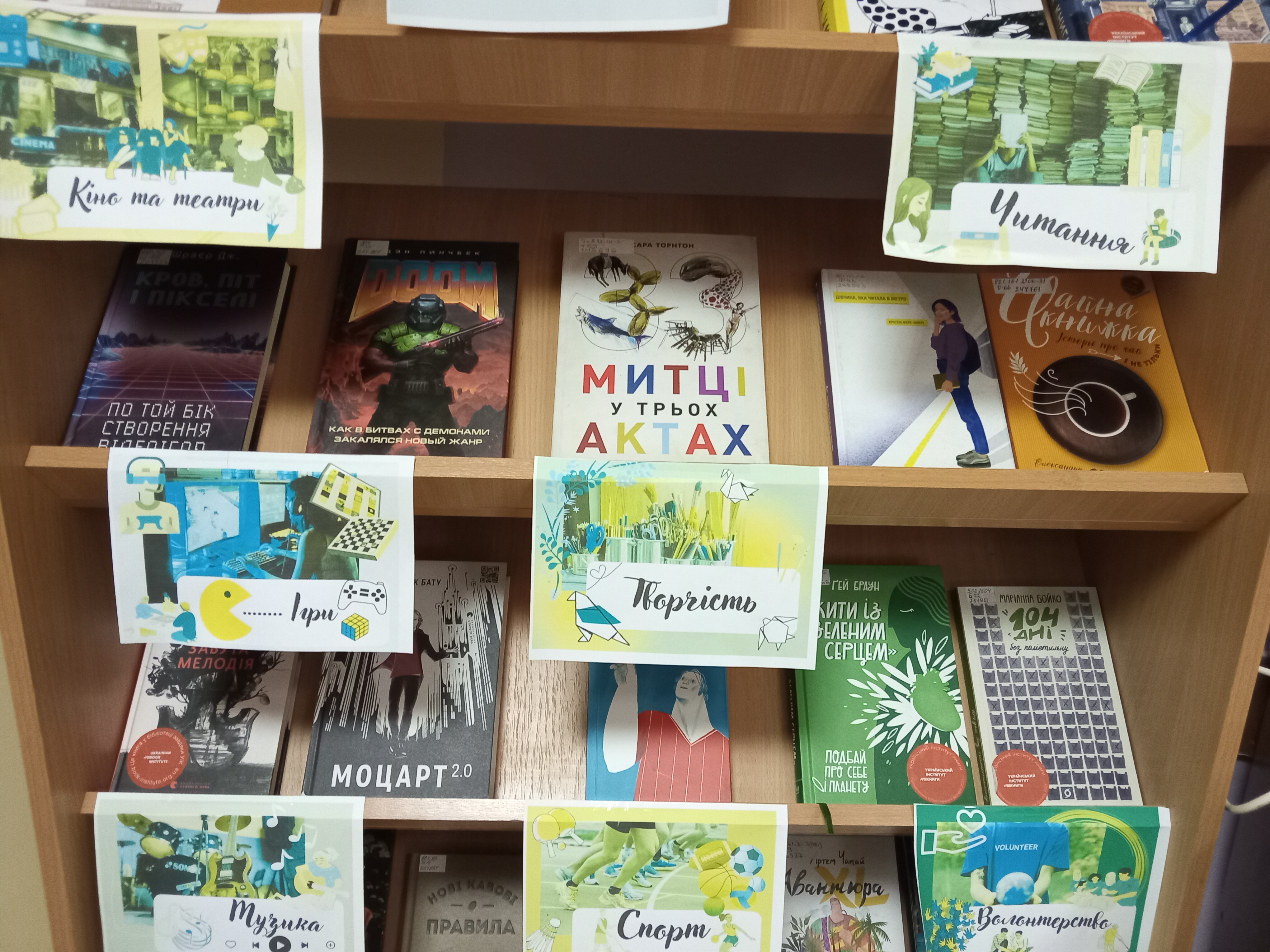 Проаналізувавши інтереси молоді, ми зробили добірку найпопулярніших сфер. Ну і звичайно за цими категоріями мы зробили книжкову виставку, щоб показати що в нас є книги на любий смак і колір!