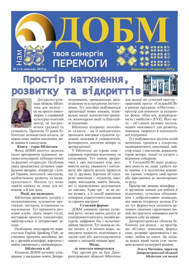 Друзі, ділимося з вами черговим випуском нашої газети — № 2 (жовтень 2025), у якому зібрано найцікавіші події, яскраві зустрічі, мистецькі відкриття та добрі ініціативи з життя нашої бібліотеки