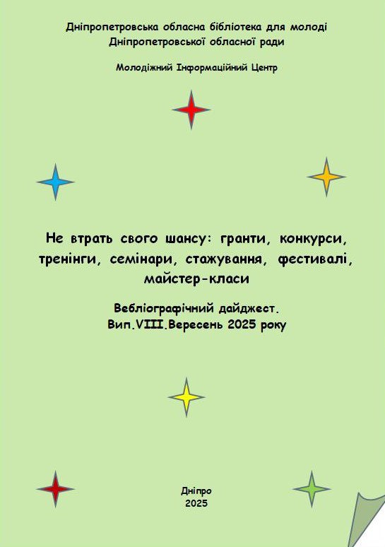 Молодіжний інформаційний центр (МІЦ) Дніпропетровської обласної бібліотеки для молоді Дніпропетровської обласної ради пропонує до ознайомлення вебліографічний дайджест «Не втрать свого шансу: гранти, конкурси, тренінги, семінари, стажування, фестивалі, майстер-класи» на Вересень 2025